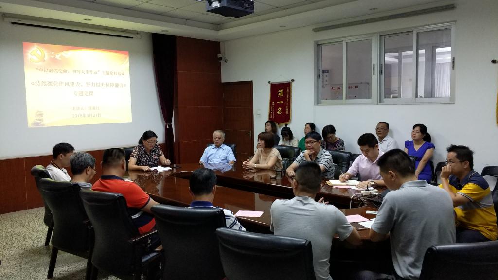 2018年6月21日下午,后勤管理处党支部开展“建党97周年纪念活动”,以支部书记上党课和重温入党誓词的形式,迎接我们党的第97个生日,校党委委员、副校长蒋一婷同志以普通党员的身份和后勤管理处党支部其他党员一道参加了活动。